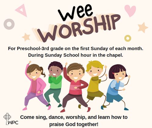 On the first Sunday of each month, Preschool - 3rd grade goes to the chapel for "Wee Worship" during Sunday School hour. 4th and 5th graders are encouraged to stay and worship with their families so they may partake in communion.