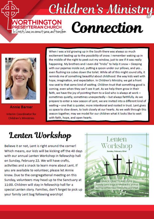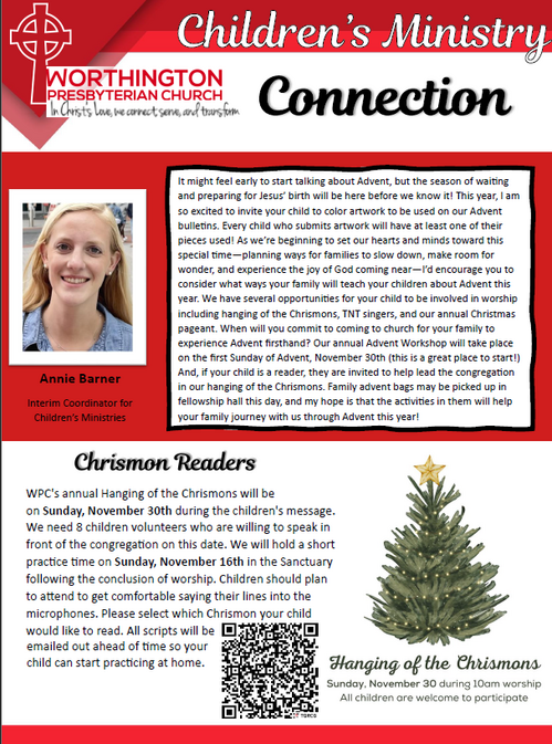 The Children's Ministry Connection is a monthly newsletter that covers all of the things that are happening in WPC's children's ministry. If you are interested in recieving this newsletter, please reach out to Annie. The current and previous editions are also available below.