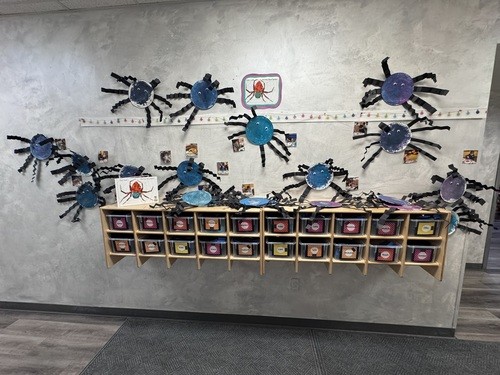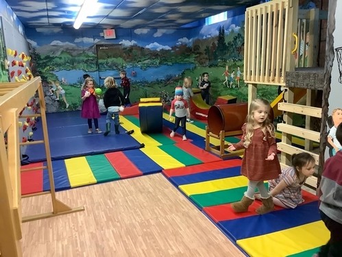 No matter the weather, every class has their own individual time using their big muscles everyday! Our outdoor playground is connected to our building and completely enclosed. It is our own private playground that is not shared with anyone else. With swings, slides, climbing walls, a basketball hoop, a playhouse and tricycles/rakes/bubbles, there are plenty of opportunities to get all their energy out! If the temperature is below 32 degrees or raining, we use our indoor Muscle Room instead......a slide, climbing wall, treehouse and obstacle course, all surrounded by a whimsical city park themed mural makes even indoor large muscle time a hit!