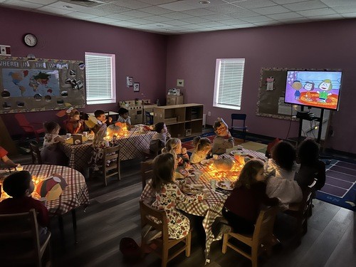 The day before Thanksgiving Break, classes gather for a Charlie Brown Thanksgiving inspired feast of Pretzels, Toast, Popcorn (Pirate's Booty) and Jelly Beans.
